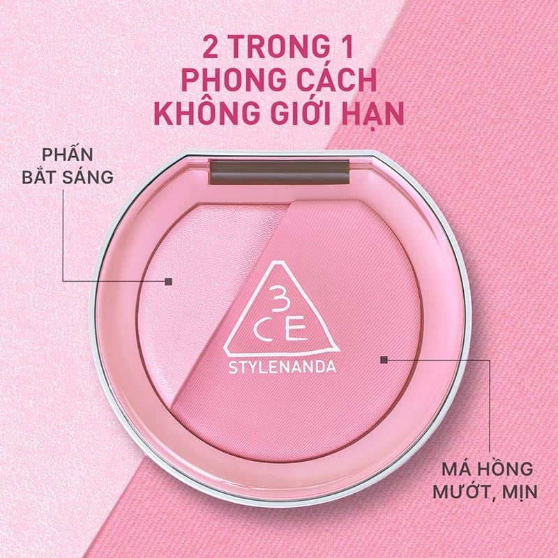 Phấn Má Hồng Bắt Sáng 3CE Blushlighter là phấn má hồng thuộc thương hiệu 3CE Sản phẩm là sự kết hợp hoàn hảo giữa má hồng và highlight trong cùng một sản phẩm, vừa tạo màu má hồng tự nhiên, vừa thêm độ sáng nhẹ, bắt sáng cho hiệu ứng rạng rỡ tự nhiên. Đồng thời chất phấn mịn nhẹ, dễ tán, bền màu cho đôi má hồng hào, tươi tắn nhiều giờ.