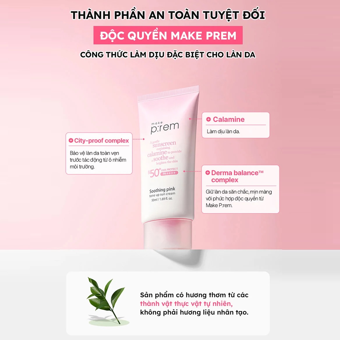 Kem Chống Nắng Vật Lý Nâng Tone Make P:rem Soothing Pink Tone Up Sun Cream SPF 50+ PA++++ 50ml nhập khẩu từ Make P:rem Việt Nam. Đảm bảo 100% về nguồn gốc và chất lượng từng sản phẩm đến tay khách hàng.