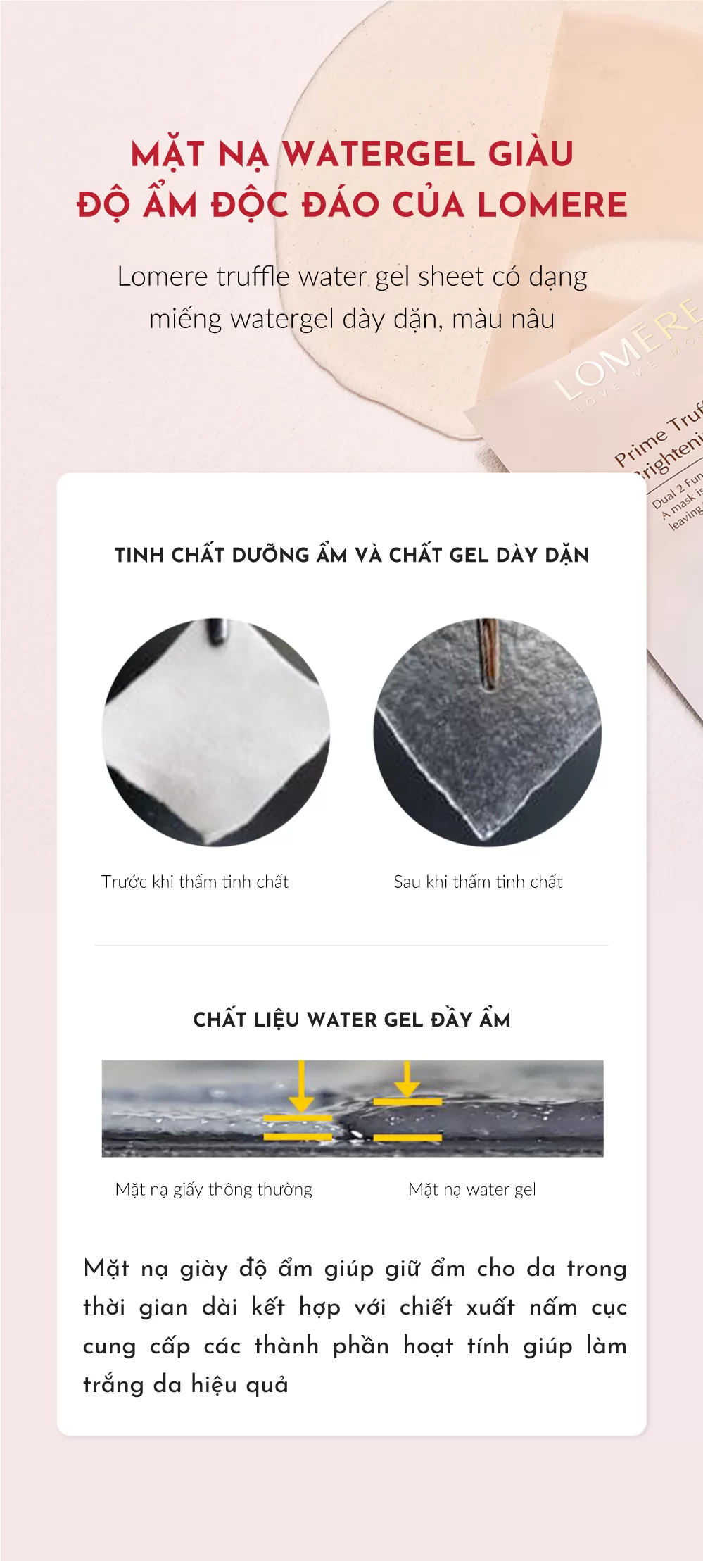 Mặt nạ dưỡng trắng, phục hồi da Lomere Prime Truffle Cell Repair Brightening Mask Sheet được sản xuất bằng công nghệ hoàn toàn mới water gel giúp chứa nhiều dưỡng chất chăm sóc da và cấp ẩm gấp 3 lần mặt nạ giấy thông thường từ đó giúp cấp ẩm sâu và làm dịu da tức thì. Ngoài ra sản phẩm có chứa thành phần nấm cục Truffle, Niacinamide, Vitamin C giúp mang lại hiệu quả làm sáng da, dưỡng ẩm hỗ trợ thải độc da, phục hồi da đang bị tổn thương một cách tức thì.