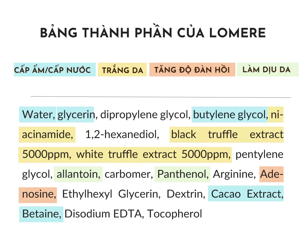 - Bảng thành phần đầy đủ: Water, glycerin, dipropylene glycol, butylene glycol, niacinamide, 1,2-hexanediol, black truffle extract 5000ppm, white truffle extract 5000ppm, pentylene glycol, allantoin, carbomer, Panthenol, Arginine, Adenosine, Ethylhexyl glycerin, Dextrin, Cacao Extract, Betaine, Disodium EDTA, Tocopherol