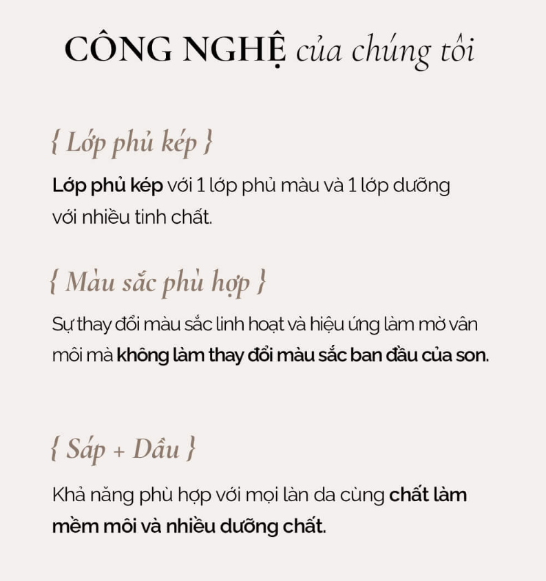 - Son có kết cấu dạng sáp mềm tan với khả năng dưỡng ẩm tốt, mang lại hiệu ứng ẩm mượt, trong veo cùng độ ẩm phù hợp giúp bạn cảm thấy dễ chịu, không gây dính khi thoa son cả ngày