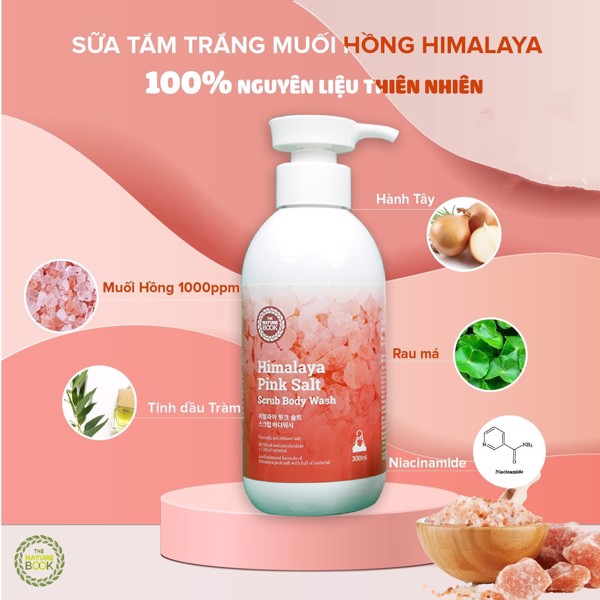 Sữa tắm dưỡng trắng da The Nature Book là sản phẩm tự nhiên hoàn toàn, được tạo ra từ muối hồng Himalaya, chiết xuất tinh dầu tràm, củ hành tây, củ tỏi và rau má, đem lại cho bạn làn da trắng sáng tự nhiên, mềm mịn và tràn đầy sức sống. Cùng với mùi hương nồng nàn, quyến rũ.