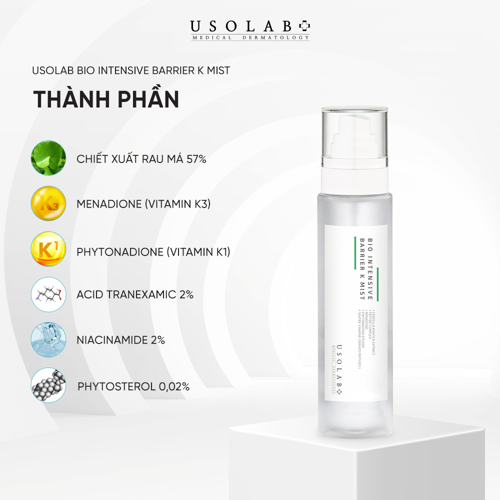 Xịt khoáng vitamin K làm dịu da tức thì, giảm bầm sưng, giảm đỏ sau các tổn thương xâm lấn, tăng cường hàng rào bảo vệ da và cân bằng da sau rửa mặt